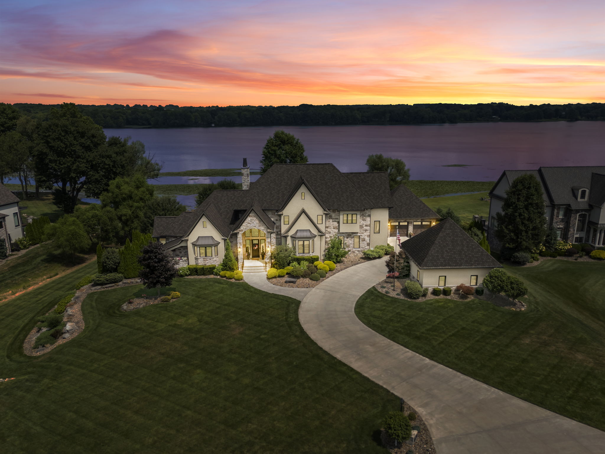 Welcome to this exceptional custom-built lakefront estate in the highly desirable Via Avellino development, located in the coveted South Range School District. Built in 2014 by Master Plan Builders, this architectural masterpiece offers over 4,811 square feet above grade plus an additional living quarters in the finished walkout lower level, combining timeless elegance with modern functionality. From the moment you arrive, the striking curb appeal, grand gables, stone accents, and manicured landscaping set the tone for what lies within. Step inside to discover a sophisticated interior featuring soaring ceilings, a dramatic 20' floor-to-ceiling stone fireplace and windows, wide-plank flooring, and an open-concept layout flooded with natural light. The gourmet kitchen is a showpiece, offering high-end cabinetry with integrated appliances, a massive waterfall island, double ovens, and panoramic views of the lake. The spacious dining area, and seamless access to the outdoor terrace make this home ideal for entertaining. The primary suite is a true retreat, with tray ceilings, a private sitting area, and a spa-like bath with a clawfoot tub, oversized walk-in shower, dual vanities, and a beverage station/coffee bar. Additional 3 bedrooms upstairs, each with their own bathrooms are equally impressive, with designer finishes and custom storage throughout. The lower level features a hidden man cave 26x30 accessible through a murphy door, with 10" sound-proof walls, and windows where you can still enjoy the gorgeous scenic views. Additionally, the walk out lower level offers a second living quarters with a full kitchen, dining and living areas rounded out by a bedroom and full bathroom. Private fenced yard, peaceful lakeside ambiance, and awe-inspiring sunsets from your own upper balcony, with every detail thoughtfully designed and executed, this lakefront masterpiece blends timeless architecture with modern comfort for a lifestyle that’s second to none.
